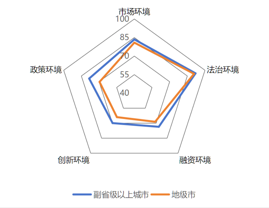从中小企业发展环境各维度得分情况来看,在法治环境、市场环境两方面,副省级以上城市和地级市的表现比较接近,在政策环境、创新环境和融资环境三方面,副省级以上城市的表现则明显优于地级市。