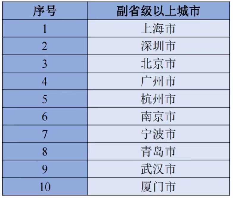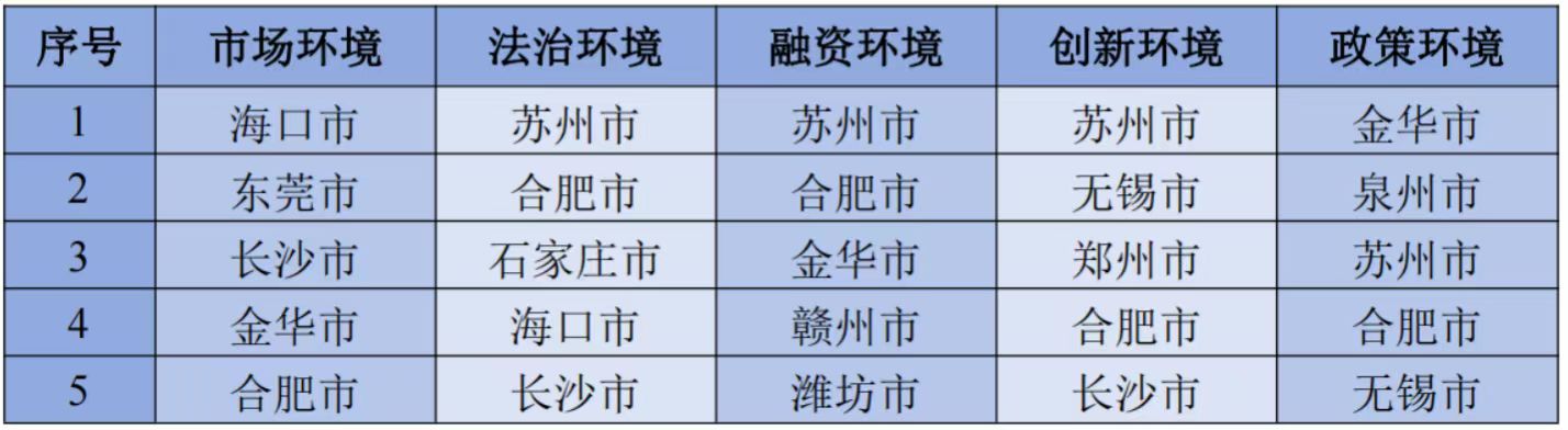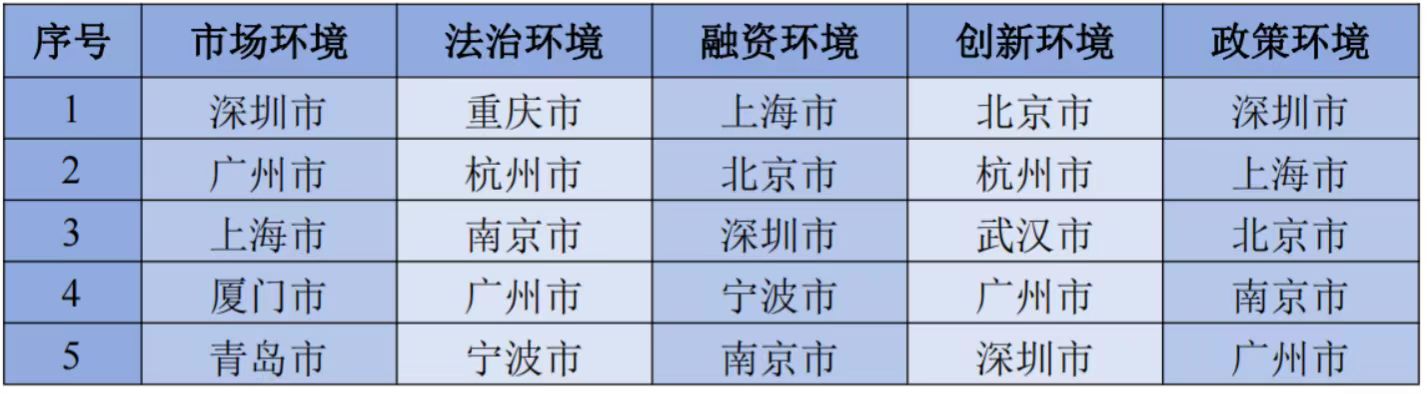 市场环境方面,深圳、广州、上海、厦门、青岛得分居副省级以上城市前5位,海口、东莞、长沙、金华、合肥得分居地级市前5位。