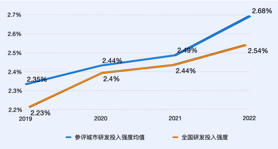 创新投入持续加大。2022年度全国研发经费投入强度达到2.5%,比上年提高0.1个百分点。参评城市2022年研发投入强度均值达到2.7%,比上年增加0.2个百分点。有43个参评城市研发投入强度比上年提高,占比达86%,其中,北京、深圳和西安等3个城市研发投入强度超过5%,分别为6.8%、5.8%和5.2%。