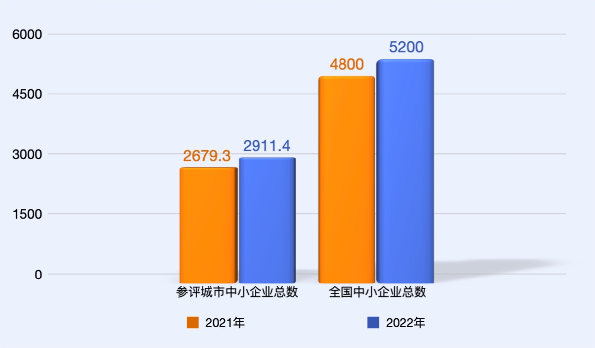 近年来,国家大力推动商事制度改革和市场准入负面清单制度改革,企业进入市场的制度性成本大幅下降,市场准入效能持续提高,有效激发市场主体活力,中小企业数量稳步增长。据统计,全国中小企业数量由2021年的4800万户增加至2022年的5200万户,增长率达8.3%;参评城市中小企业由2021年的2679.3万户增加至2022年的2911.4万户,增长率达8.7%。2023年全国新设经营主体3272.7万户,同比增长12.6%,其中新设企业1002.9万户,同比增长15.6%。
